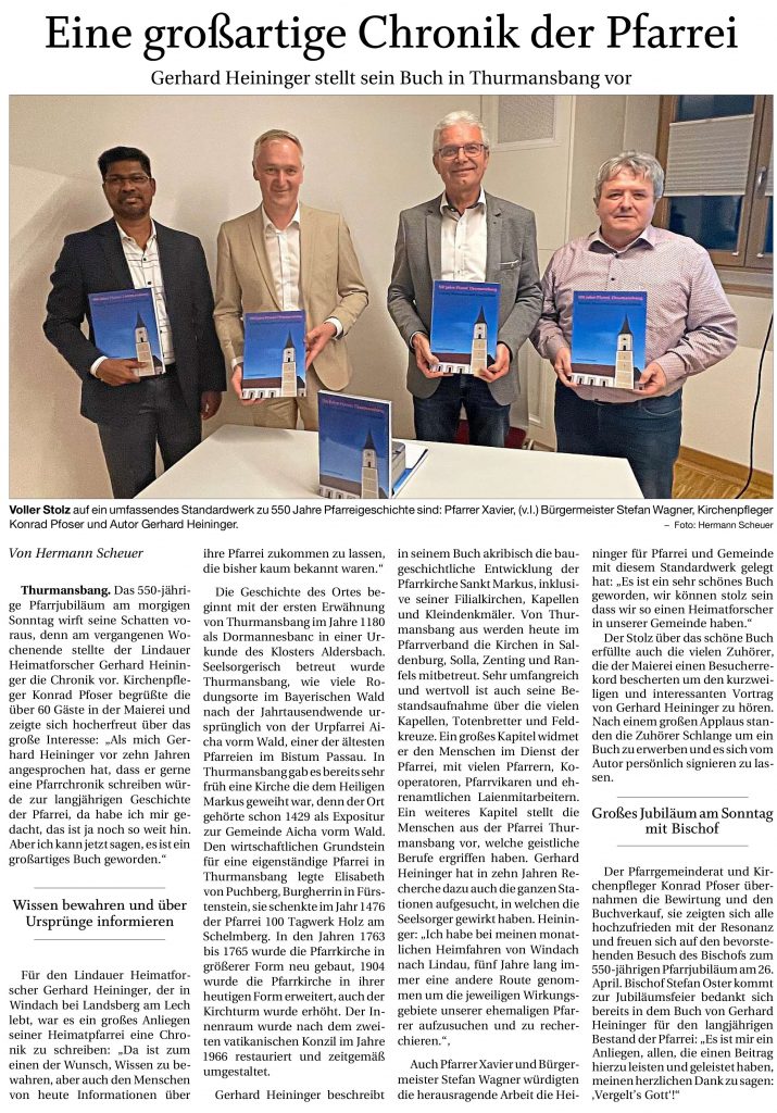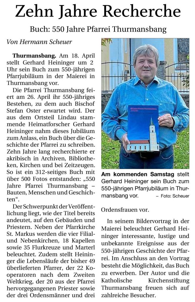 Die Pfarrei Thurmansbang feierte am 26. April 2026 ihr 550-jähriges Bestehen. Ich nahm dieses Jubiläum zum Anlass, ein Buch über die Geschichte der Pfarrei zu schreiben.